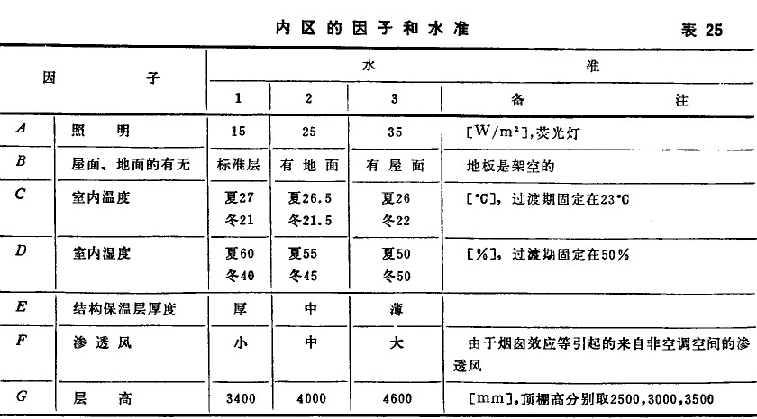 在表11中給出全年負荷計算方法的種類。在略算法中,根據實驗設計法利用推斷表的方法,是在對負荷的大小有影響的因素(例如窗面積比)的幾個水準(例如20%, 40%,60%三個水準)中選出一個,只要用簡單的加減運算便可求出負荷某種程度的增加或減少,因而是非常便利的。這里給出的是由日本建筑學會節能小委員會作成的表。