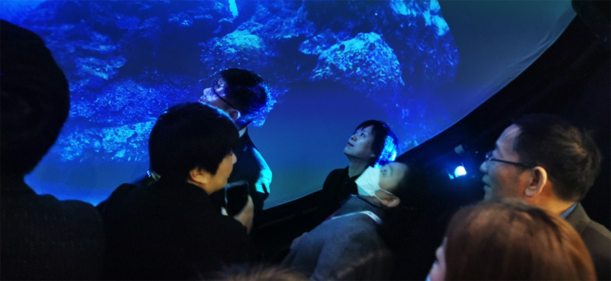 步入該展館東區(qū),一個由密閉的正方形和圓形魔盒組成的展位前排起了長隊。游客好奇地依次進入魔盒,仿佛置身于沉浸式“小宇宙”,360°光影秀帶來奇幻感受。魔盒內(nèi)展示著遨游宇宙的太空船內(nèi)景象,游客仿佛穿梭于浩瀚的太空,和宇宙天體擦身而過,忽然多個隕石襲來,大家下意識地向旁邊閃躲,引發(fā)現(xiàn)場觀眾的驚嘆聲。
