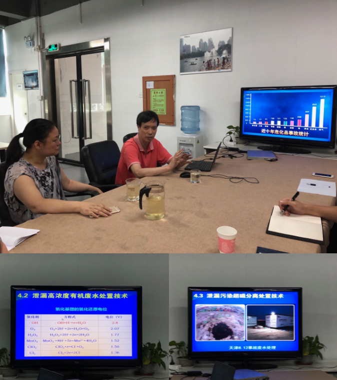 我司鄭總向張主任詳細(xì)介紹了公司幾年來在污水深度處理、大型湖泊的生態(tài)治理、大型水樂園水處理等方面做的工作,張主任對(duì)我司取得的成績予以了充分肯定,并提出了多項(xiàng)技術(shù)改進(jìn)建議。張主任還為在家的公司工程設(shè)計(jì)人員舉辦了一場《?;沸孤段廴緫?yīng)急處置技術(shù)與裝備》專題講座,并就大家關(guān)心的泄漏高濃度有機(jī)廢水處理技術(shù)進(jìn)行了詳細(xì)講解,大家受益匪淺。