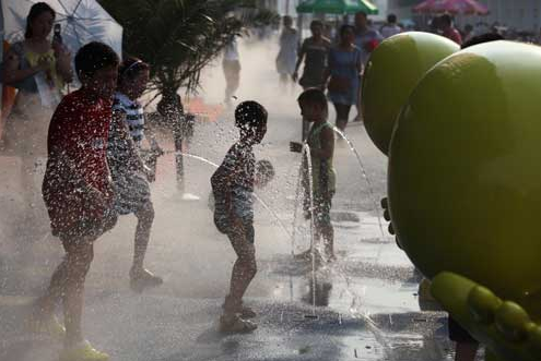 8月12日,世博園石油館門前的噴水池成了兒童樂園。