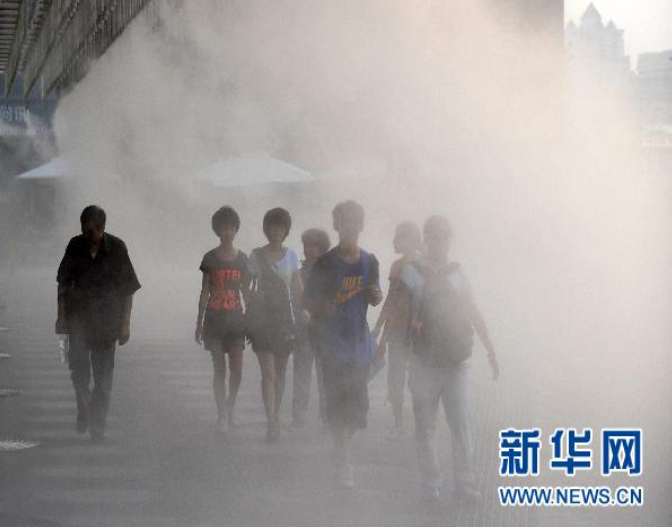 8月12日,在上海世博園上海企業(yè)聯(lián)合館前,游客在霧氣中穿行。當(dāng)日下午,記者在上海世博園上海企業(yè)聯(lián)合館前看到,噴霧降溫裝置正在發(fā)揮威力,游客猶處云霧之間,別有一番趣味。當(dāng)日世博園區(qū)最高氣溫達(dá)到了39.6攝氏度。新華社記者丁海濤攝