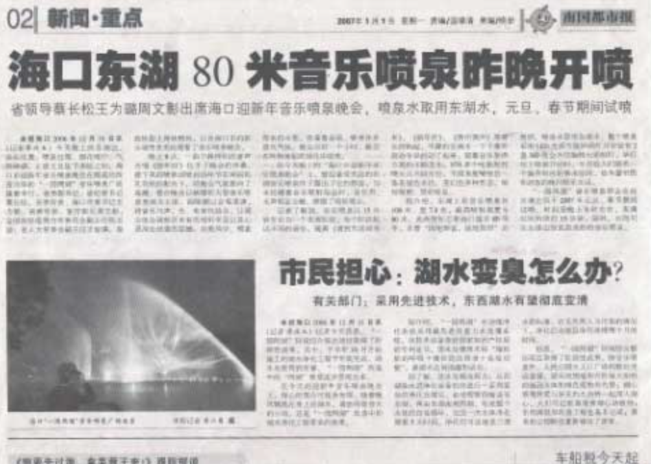在今天的迎新年音樂噴泉晚會上,細心的觀眾可能會發(fā)現(xiàn),隨著晚風飄落在身上的湖水,清新得像春天的小雨。這是“一園兩湖”改造中的湖水凈化工程帶來的效果。