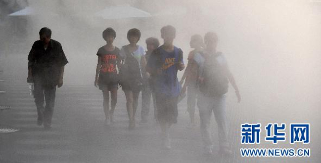 8月12日,一名小游客在上海世博園上海企業(yè)聯(lián)合館前擁抱“云霧”。當日下午,記者在上海世博園上海企業(yè)聯(lián)合館前看到,噴霧降溫裝置正在發(fā)揮威力,游客猶處云霧之間,別有一番趣味?! ?/p>